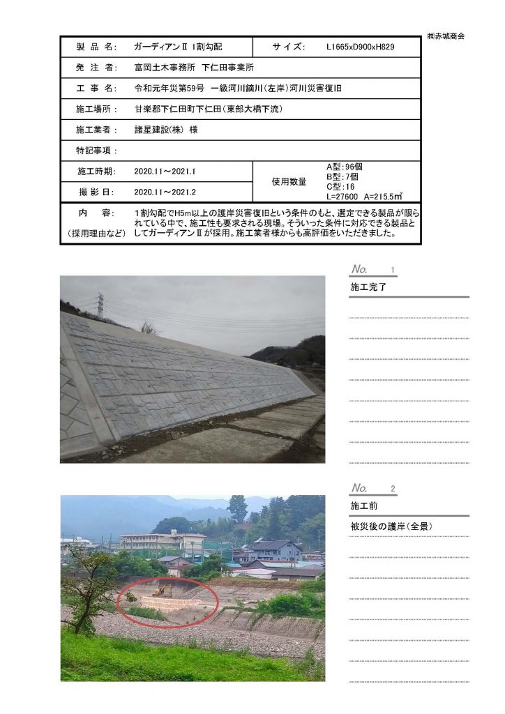 発注者:群馬県富岡土木事務所下仁田事業所 施工:諸星建設株式会社現場名:令和元年災第59号 1級河川鏑川(左岸)河川災害復旧工事1割勾配の護岸工事。災害復旧事業のため、施工性も求められました。予め、工場でブロックを組み立てていくので、現場での作業も少なく(省力化)、工事も工期にないにスムーズに完了することも出来ました。 ガーディアンⅡの特徴・1割から3分まで対応➜幅広い条件に対応 ・ブロック控え厚が10cm刻みで検討可能➜過剰設計にならず経済的・色々な工法に対応可能➜等厚式擁壁だけでなく不等厚式擁壁にも対応可能ガーディアンⅡのカタログはこちらからダウンロード出来ます。 https://akagi-sk.co.jp/catalog/download/guardian2.pdf